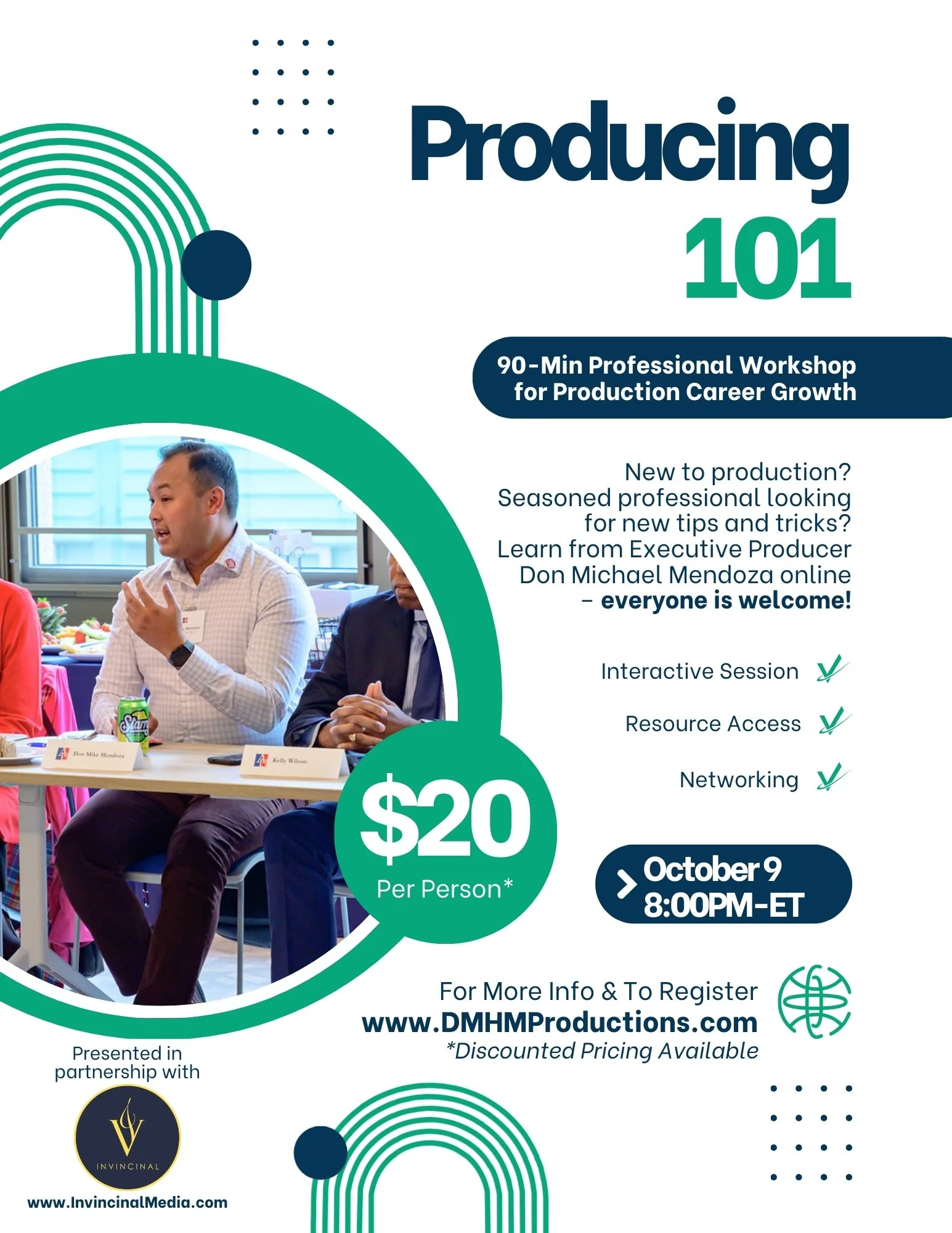 Register for this virtual workshop happening on Thursday, October 9, 2025 at 8:00PM-ET presented in partnership with Invincinal Media and experience an in-session Q&A, networking time, and sign-off with helpful resources to take with you to help launch or fortify your production career.