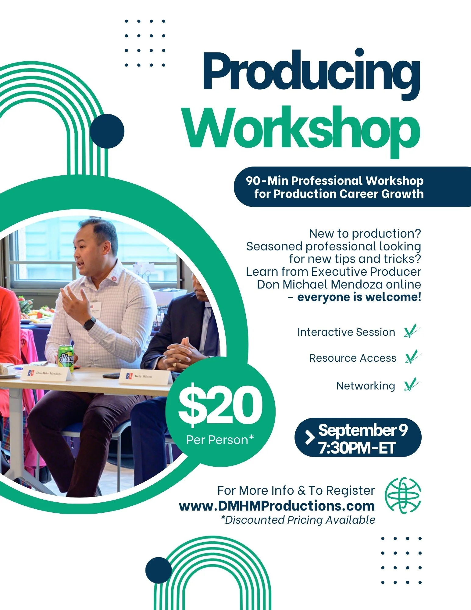 Register for this virtual workshop happening on Tuesday, September 9, 2025 at 7:30PM-ET and experience an in-session Q&A, networking time, and sign-off with helpful resources to take with you to help launch or fortify your production career.